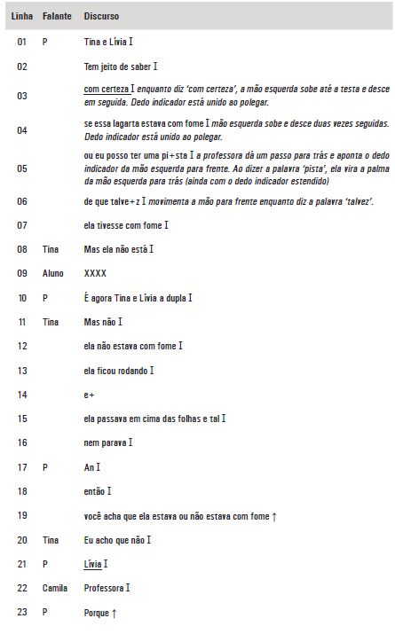 O interessante nesse tipo de análise é que as pessoas lançam mão das pistas de contextualização “sem a necessidade de uma consciência explícita do seu uso” (BLOOME et al., 2005, p. 14). Dessa forma, temos acesso a certos sinais que os participantes usam para compartilhar mensagens que poderiam estar invisíveis a um olhar desatento, por exemplo, sentimentos de cortesia ou grosseria, desejo de dar mais ou menos destaque a uma ideia, e maior ou menor engajamento em certa atividade conjunta. No caso da análise que apresentamos, a ênfase na palavra pista, bem como outros elementos microcontextuais, nos deram sinais de que esse recurso fora significativo para o grupo, o que foi corroborado por outras evidências ao longo de nossa investigação.3 Evidentemente, entendemos que, ao trabalhar com pistas de contextualização, não se pretende compreender o estado interno das pessoas e suas intenções individuais. Antes, a partir das consequências do que se fala, analisando como as pessoas agem e reagem umas às outras, buscamos interpretar os significados compartilhados pelo grupo a partir da perspectiva dos participantes, objetivo chave da perspectiva etnográfica.