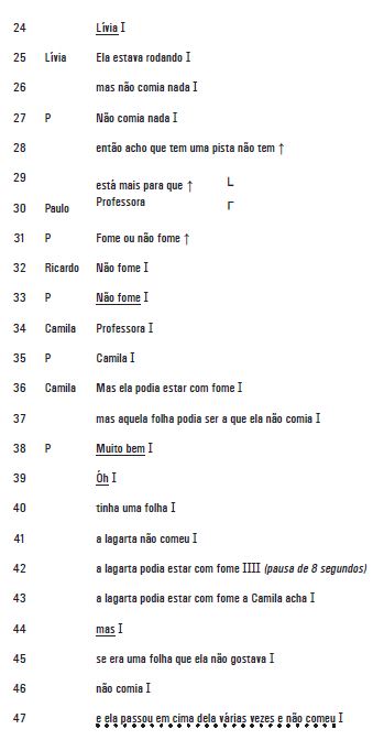 Para compreender melhor os desdobramentos desse impasse, ampliamos nosso olhar sobre essa interação. Depois desse momento, o grupo começou uma discussão sobre o que poderia ser feito para saber se a lagarta estava com fome. As crianças ofereceram três possibilidades: abrir a lagarta, dar diferentes tipos de folhas e observar a barriga da lagarta. Estas possibilidades estão relacionadas a modos de gerar dados que poderiam auxiliar na construção de uma reposta e resolver a diferença de pontos de vista. Ou seja, as crianças começaram a fazer discussões que se afastaram de uma definição de resposta e passaram a discutir como essa resposta seria construída, retomando um direcionamento mais metacognitivo do discurso.