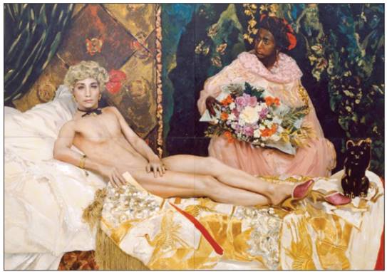 De imediato, no caso das duas imagens que trazemos para análise, entendemos que se trata de clivagens que afrontam diferentemente uma aparente unidade do sujeito dos feminismos, qual seja, aquela relativa à interseccionalidade de raça e gênero. No caso de Futago, a serva de Olympia, Laura, prostrada atrás do seu leito, nos mostra o artista japonês em uma espécie de black face, em um tensionamento das intersecções do discurso racial com o discurso da diferença sexual, agindo, de algum modo, como “um duplo retorno dos reprimidos”, conforme observou Norman Bryson (1996, p. 179) acerca de Futago. Como um corpo, ao mesmo tempo, negro e asiático, Laura-Morimura marca o lugar de outridade dessas duas experiências em nossa cultura, em sua subalternização a outras experiências igualmente marginalizadas: a da mulher branca e a da cortesã. Do encontro desses muitos outros (mulher, negra, asiática, branca, cortesã), emerge uma contribuição singular da imagem para pensarmos as marcas colonizadoras de nossa cultura, mas, singularmente, dos próprios feminismos, neste caso, por meio de relações de poder que se impõem entre as mulheres.