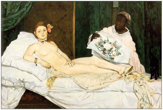 Para muitos, a arte de Manet - e a pintura Olympia, de modo especial - expressa uma ruptura como as normas do sistema de arte acadêmico e, por isso mesmo, uma forma de pensar a sociedade. O escândalo causado por Olympia, no Salão de 1865, teria sido, em alguma medida, emblemático das formas como a estética empreendida por Manet tensionava uma questão de classe, como colocou T. J. Clarck (2004, p. 208), em seu livro sobre a obra de Manet e a modernidade: “o signo de classe na Olympia era a nude”. De modo mais preciso, na contramão das representações acadêmicas idealizadas da prostituição, Olympia dava a ver a classe inerente ao corpo da cortesã, pois a forma como o seu corpo foi idealizado por Manet colocou a burguesia oitocentista diante da nudez de Victorine Meurent (uma cortesã da classe trabalhadora) e conectou seu corpo a algumas características da cultura erudita da época (Ibidem).