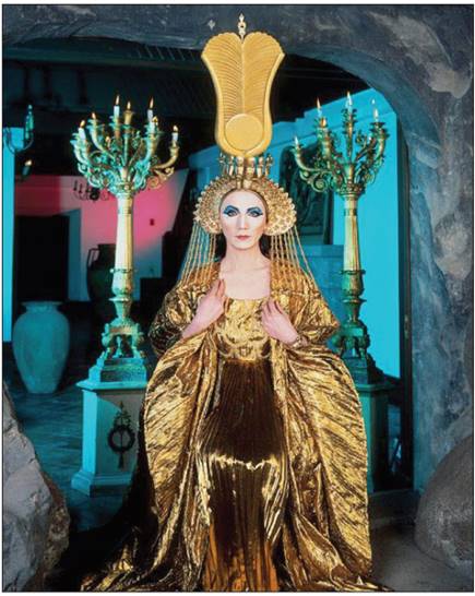 O autorretrato After Elizabeth Taylor 1 (Imagem 4) - produzido em 1996, como parte da série Actor/Actresses, realizada ao longo dos anos 1990 e composta por releituras de memoráveis personagens da história do cinema interpretadas por atrizes de Hollywood - partilha, em certa medida, desta crítica às estruturas binárias do discurso (neo)colonial. Em uma releitura da personagem Cleópatra, vivida por Elizabeth Taylor no filme de Joseph Mankiewic, de 1963, a imagem de Morimura se insere no seio de um intenso debate sobre as formas como a rainha Cleópatra incorpora, literalmente, os signos que a cultura ocidental reservou ao Oriente (SHOHAT, 2003). No autorretrato, temos uma Cleópatra trajando um vestido em lamê dourado, com as mãos prostradas sobre os adornos dos cabelos e uma coroa inspirada na representação de rainhas do Egito faraônico - referências tomadas de empréstimo da suntuosa cena em que a Cleópatra de Elizabeth Taylor chega a Roma para encontrar Júlio César (Imagem 5).