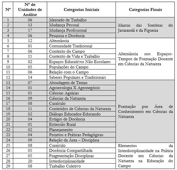 No processo de categorização, as 131 unidades de análise foram sendo agrupadas, por contraste e comparação, e constituíram 29 categorias iniciais. De acordo com Moraes e Galiazzi (2016), cada unidade de análise pode formar uma ou mais categorias iniciais. Portanto, dessas 29 categorias iniciais, 25 possuíam relação com as três categorias finais definidas a priori. No entanto, quatro categorias iniciais não apresentavam relação direta com as categorias definidas anteriormente e formaram uma categoria emergente, denominada de Marcas das Sombras do Jacarandá e da Figueira.