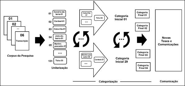 Na etapa de unitarização ocorreu o movimento desconstrução/desmontagem dos textos que constituíram o corpus da pesquisa. Iniciamos a leitura e significação das seis transcrições das entrevistas, e após, foram mapeados e detalhados os elementos constituintes dos textos, dos quais selecionamos 131 fragmentos (ou excertos), denominados unidades de análise. Estes foram codificados, substituindo-se o nome do entrevistado/entrevistada pelo nome de um pássaro, como já mencionado, acompanhado pelo número do fragmento extraído da sua entrevista.