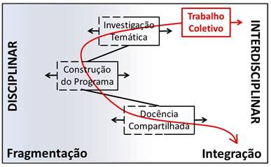 Nesta síntese, a relação entre fragmentação e integração é dialética, e entre esses dois extremos, movimentam-se a investigação temática, a construção do programa e a docência compartilhada. O trabalho coletivo transversaliza todas as etapas, atuando em todos os movimentos, pois, para que haja interdisciplinaridade, o trabalho coletivo se constitui como elemento central. A investigação temática que, localizada na fronteira entre integração e fragmentação, permite mover-se entre os dois extremos, na medida da necessidade das etapas da investigação dos temas.