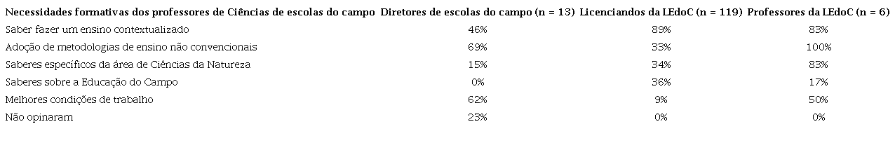 Os professores de Ciências de escolas do campo que participaram da pesquisa, ao serem questionados sobre as suas necessidades formativas, mencionaram apenas: melhores condições de trabalho (91%); adoção de metodologias não convencionais de ensino (73%); e saberes específicos da área de Ciências da Natureza (73%). Contudo, os informantes-chave mencionaram, além dessas, outras necessidades como a de se contextualizar o ensino e os saberes sobre a Educação do Campo - conforme a Tabela 1, com as porcentagens de respostas, onde n representa o total de informantes de cada grupo.