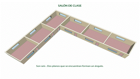 El salón de clase tiene piso, paredes y techo. Las paredes están verticales, el piso y el techo están bajo nuestros pies, las paredes en torno nuestro y el techo sobre nuestra cabeza. Hay pared del frente, de la derecha, y de la izquierda y del fondo. Todo el piso como las paredes y el techo, son superficies planas. Son seis. Dos planos que se encuentran forman un ángulo (un ejemplo se presenta en la Imagen 2). Hay cuatro ángulos verticales y ocho horizontales (Ver Imagen 3). Tres planos que se encuentran forman un rincón: hay ocho rincones. Los pisos pueden ser de madera, ladrillo, azulejos, piedra, cemento, etc. Algunos están cubiertos por alfombras. Las paredes pueden estar tapizadas ó pintadas, ó no tener ningún revestimiento. Se construyen de madera, zacate, adobe, ladrillo, piedra, etc. Algunos techos están cubiertos por in cielo raso. Pueden ser de ladrillo, madera, paja, zinc, teja ó pizarra. Los hay planos, piramidales, cónicos, etc. (se pueden apreciar en la Imagen 4). El salón tiene además puertas y ventanas. Por ellas entra el aire y la luz. En ciertos techos hay tragaluces ó linternillas. El salón contiene muebles. Para construir un salón se necesitan no sólo albañiles, sino también otras varias clases de obreros7.
