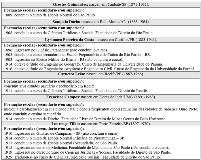 Orestes Guimarães, Sampaio Dória, Lysimaco Ferreira da Costa, Carneiro Leão, Francisco Campos e Lourenço Filho foram tomados como atores desse repertório e, pela ressonância de suas ações, pode-se afirmar que foram intelectuais que reivindicaram a modernidade educacional, propondo projetos em consonância com os ideais pretendidos pela nação.