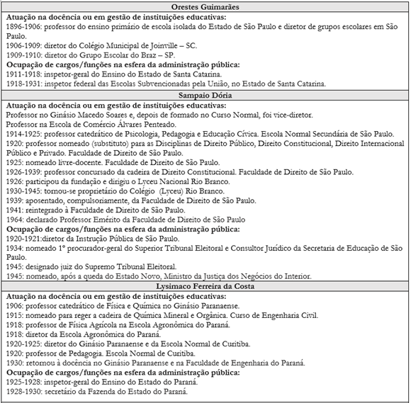 Todos foram professores e exerceram funções públicas e administrativas ligadas à educação - foram inspetores ou diretores da instrução pública em estados brasileiros ou na capital federal -, estiveram envolvidos em movimentos reformistas ou em movimentos que pretendiam a renovação educacional, em âmbito estadual ou federal e participaram de conferências educacionais, compondo o que aqui se assinala como integrantes de um repertório.