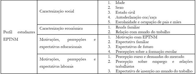 Conforme já explicitado na seção anterior, ocorreu contato 115 estudantes de EPTNM, os quais responderam inicialmente a um questionário de duas páginas. A primeira se estruturou em torno de um questionário que caracterizava o perfil socioeconômico e familiar. Na página seguinte, as perguntas versavam sobre a compreensão das motivações, percepções e expectativas de estudantes de EPTNM acerca de aspectos referentes tanto ao mundo do trabalho quanto à formação profissional. Apresenta-se abaixo, sinteticamente, a estruturação do questionário, no quadro a seguir: