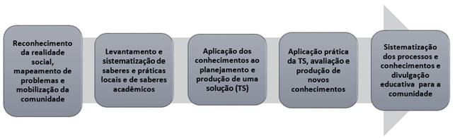Costa (2013) ressalta, entretanto, que a TS, como instrumento de políticas públicas, carece de mediação entre as formas de funcionamento do Estado e as dinâmicas sociais das comunidades. Tal mediação pode ser desempenhada por atores ligados a organizações não governamentais e instituições de ensino e pesquisa, colaborando não só com os atores internos das comunidades-alvo, mas, também, com suas próprias instituições, pois, como destacam Klossowski, Freitas e Freitas (2016, p. 62), as ações de pesquisa e extensão são meios para operacionalizar o papel social das instituições públicas de ensino e aproximá-las da sociedade. Nesse sentido, as TS têm grande importância como instrumento de aplicação de ações extensionistas voltadas para demandas da sociedade sob uma perspectiva em que o saber científico possa se associar ao saber popular, em uma “relação de reciprocidade, mutuamente transformadora”, (JEZINE, 2004, p. 3) e contribuir para a construção da autonomia e organização dos atores sociais das comunidades e para a transformação da realidade social.