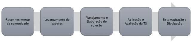 A partir desse cenário, levantou-se a hipótese de que, entre os motivos da escassez de projetos de extensão em TS nos IFs, poderia se destacar a ausência de recursos de apoio metodológico sistematizado para a formação docente voltados ao desenvolvimento desse tipo de projeto. Para desenvolver soluções tecnológicas como as TS de modo sistemático, por meio de ações e projetos de extensão, é preciso criar itinerários e recursos educacionais de apoio à formação continuada dos docentes da EPT voltada para a mediação de práticas de intervenção social local