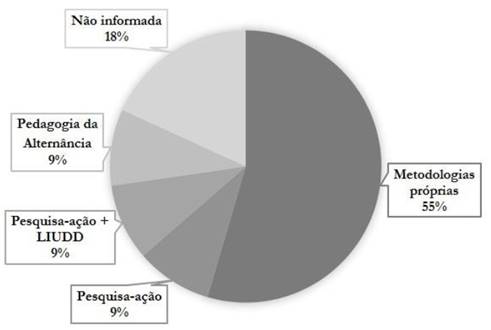 A subcategoria “Metodologias próprias” foi criada durante a pesquisa para nomear as diversas metodologias, especialmente criadas para o desenvolvimento de cada TS abordada, em seus contextos específicos. Tal categoria revelou-se predominante nos estudos mapeados.