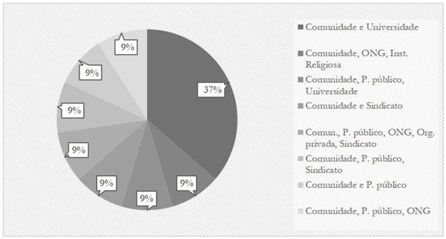 Quanto à composição das redes de atores sociais envolvidos nas TS mapeadas, descobriu-se que todos os tipos de composição de atores encontrados incluíam a Comunidade como membro, o que corrobora a caracterização dos projetos descritos nos estudos selecionados como sendo efetivamente TS, posto que um plano de trabalho pouco ou não participativo é, segundo Souza e Rufino (2017), critério primordial de exclusão de um projeto de intervenção social do rol das TS, e destacou-se como composição predominante, cerca de 37% do total, a que reúne “Comunidade” e “Pesquisadores de Universidades”, sendo que nenhuma rede incluiu pesquisadores de IFs.