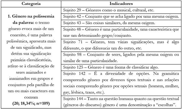 E por esses debates e ressignificação, que permanecem em aberto, seria mais adequado falar em conceitos de gênero, no plural, dada a variedade de significados que são atribuídos à palavra gênero contemporaneamente. Nesse sentido, a primeira categoria que representou as concepções das(os) graduandas(os) sobre o conceito de gênero, a qual identificamos com base na técnica de AC e na literatura pertinente, foi intitulada de Gênero na polissemia da palavra. No quadro a seguir, retratamos essa categoria, constituída a partir dos indicadores extraídos das respostas dadas pelas(os) participantes, também retratados (alguns deles) no quadro 1.