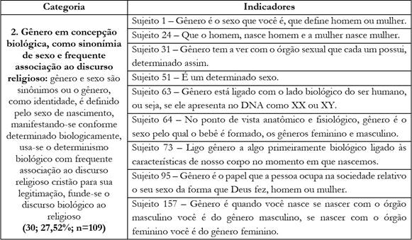 Enquanto na primeira concepção de gênero identificada admite-se sua pluralidade conceitual, porém apontando para o significado inicial e quase comum de classificação que dispõe, a concepção seguinte referiu-se a um conceito de gênero em específico: para os sujeitos que detêm essa concepção, gênero é o mesmo que sexo. Indicadores extraídos das respostas de 30 sujeitos, sendo 27,52% do total de respondentes, geraram a categoria representativa dessa concepção, a qual foi intitulada de Gênero em concepção biológica, como sinonímia de sexo e frequente associação ao discurso religioso.