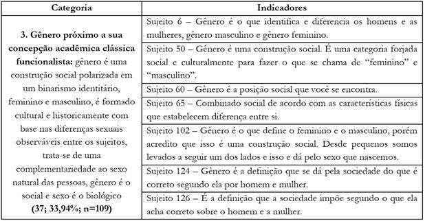 A categoria representativa seguinte foi constituída a partir dos indicadores das respostas de 37 sujeitos, sendo 33,94% do total de respondentes, denominando-a de Gênero próximo a sua concepção acadêmica clássica funcionalista. Das concepções expostas neste artigo, essa é a que mais se alinha com a perspectiva que defendemos, sendo ela a feminista, para fundamentar a formação em gênero das(os) docentes responsáveis pela educação escolar, devido ao seu caráter potencialmente emancipatório e crítico. Apesar de alinhar-se, não corresponde, de fato, à perspectiva que defendemos, visto que a simples distinção entre a biologia e o social, cerne desta concepção de gênero, “[...] está relativamente simplificada para dar conta das diferentes possibilidades do debate feminista atual” (NOGUEIRA, 2017, p. 47).