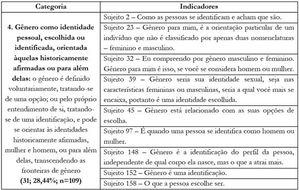 A categoria denominada de Gênero como identidade pessoal, escolhida ou identificada, orientada àquelas historicamente afirmadas ou para além delas, foi constituída a partir dos indicadores extraídos das respostas de 31 sujeitos, concernente à 28,44% do total de respondentes. A concepção de gênero a qual representa não se refere nem ao sexo biológico e nem às construções sociais feitas sobre as diferenças sexuais, como as concepções representadas pelas duas categorias anteriores se referiram. O quadro 4 apresenta a categoria representativa dessa nova concepção de gênero.