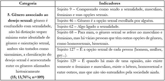 A última das categorias identificadas, denominada de Gênero associado ao desejo sexual, foi constituída por meio dos indicadores das respostas de 15 sujeitos, equivalente a 13,76% do total de respondentes. Nessa concepção, como também identificou Kelly da Silva (2015, p. 86) em outro contexto, relaciona-se indevidamente dois aspectos respectivos a dois temas, “[...] gênero e sexualidade”, que, de fato, são relacionais, porém, na forma como são trazidos, “parece haver uma confusão entre esses conceitos”, como mostra o quadro 5.