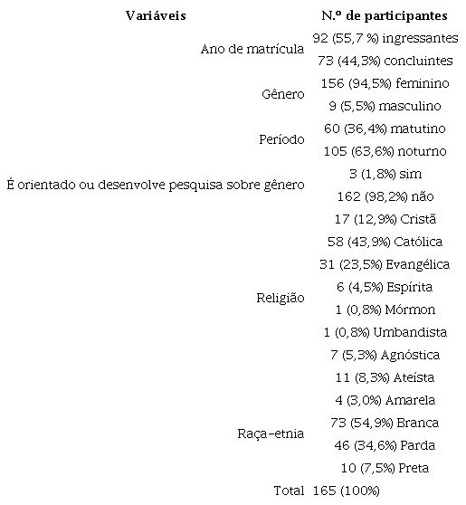 Com a caracterização da amostra respondente do questionário (N=165), identificamos que esse público da pesquisa foi majoritariamente feminino (n=156; 94,5%), tendo em vista a consolidação do curso de Pedagogia como um espaço exclusivamente feminino na história da docência no Brasil, conforme argumenta Tânia Suely Antonelli Marcelino Brabo (2005) sobre o processo de feminização do magistério. Também majoritariamente foram as(os) participantes matriculadas(os) no período noturno (n=105; 63,6%), devido ao maior número de turmas do noturno em contraponto às matutinas (n=60; 36,4%), e no primeiro ano do curso (n=92; 55,7%), em razão da maior adesão à pesquisa das(os) ingressantes do que das(os) concluintes.