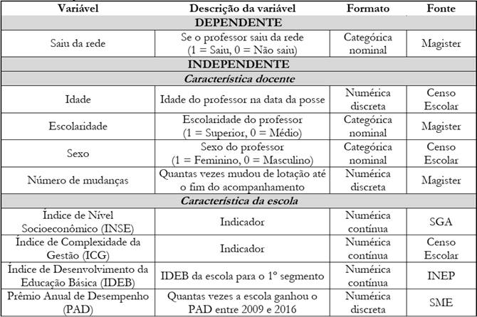 O quadro 1 a seguir apresenta as variáveis utilizadas nas análises. A seleção dessas variáveis teve como base a literatura sobre o tema, discutida anteriormente. As variáveis foram divididas em dois grupos: características dos docentes e características das escolas. As características dos docentes são fixas no momento da posse, e as características das escolas são em relação à última escola em que o professor esteve lotado. Para os professores que não saíram da rede, a última escola corresponde à sua lotação em novembro de 2016.