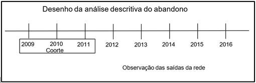 Abandono docente se define como a saída do/a professor/a , não apenas da escola em que está lotado, mas da rede. No caso dos nossos dados, apesar de estarmos chamando de abandono, podemos ter casos de saídas esperadas, como aposentadorias ou falecimento. Como não temos acesso ao motivo que levou o docente a sair do sistema, toda saída está sendo considerada abandono. Isso significa que nossos resultados podem estar superestimados. No entanto, como consideramos somente os professores que ingressaram na rede nos anos de 2009, 2010 e 2011, supomos que a aposentadoria não seria um fenômeno frequente na coorte foco do estudo.