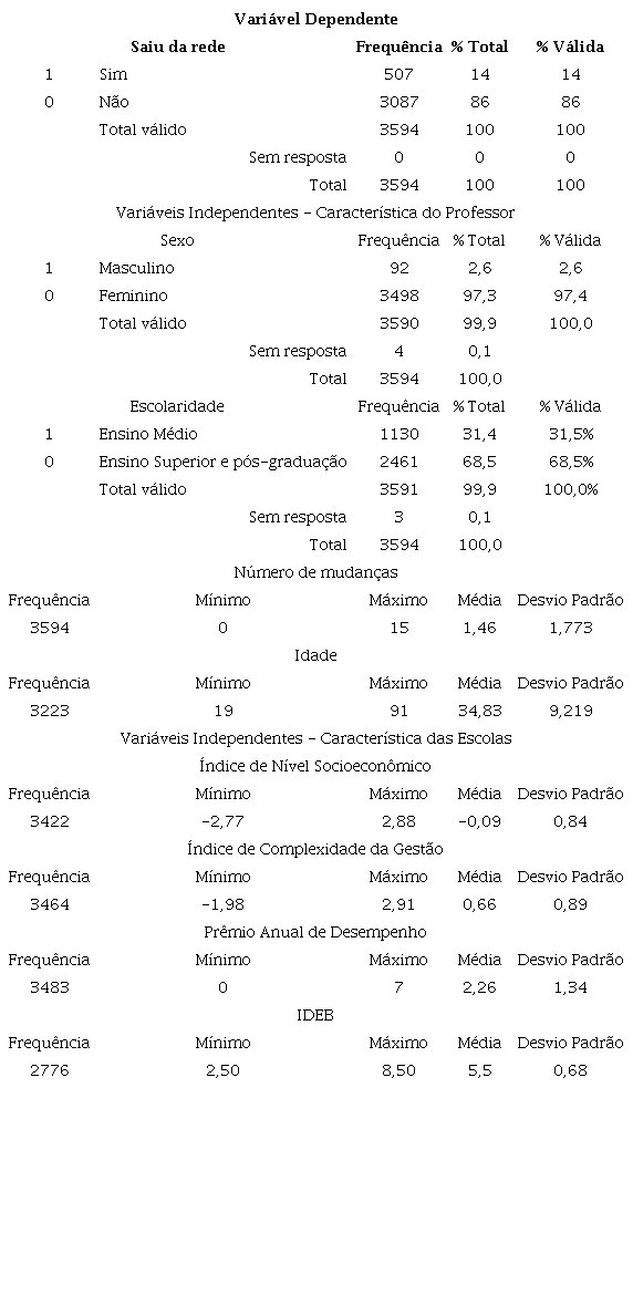 A tabela 1 apresenta as estatísticas descritivas das variáveis utilizadas nos modelos de regressão estimando o risco de abandono da rede.