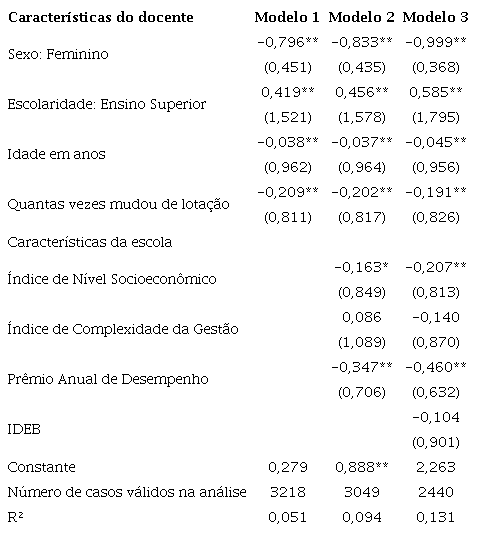 A tabela 4 traz os resultados da regressão logística para estimar o abandono docente. Usamos o método de inserção em três blocos (Enter Method), o primeiro com as características dos docentes, no segundo, acrescentamos as características das escolas sem o IDEB e no terceiro, incorporamos todas as variáveis. O IDEB só foi inserido no último modelo, uma vez que diversas escolas não possuem o indicador e, portanto, as análises que incluem esta variável apresentam uma considerável perda de casos.