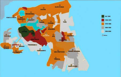 Por este mapa, percebemos os movimentos de expansão da cidade: a área restrita às proximidades do centro histórico até 1948 (cor verde); a formação do Bairro João Paulo e os conjuntos habitacionais da COHAB até 1970 (cor vermelha); o surgimento dos empreendimentos residenciais COHAMA, Bequimão e COHATRAC; a conformação do Renascença, São Francisco e Ponta D’Areia (bairros de classe média e alta), paralelamente ao crescimento das comunidades periféricas do Anjo da Guarda, Vila Embratel e Vila Palmeira até 1980 (cor alaranjada), entre outras ocupações posteriores. Destacamos aqui a distância estabelecida entre a Universidade Federal do Maranhão e a Vila Palmeira via localização; bairro periférico próximo ao mar e às nascentes do Rio Anil para onde o Colégio Univesitário da UFMA se transferia e reestruturara como Colégio de Aplicação, localidade onde casebres e palafitas deram origem a uma “cidade sobre o mangue”construída pelas táticas de apropriação de quem não planeja simplesmente porque não possui um lugar e, assim, representam a expectativa de uma vitória do tempo sobre o lugar, já que jogam de acordo com a ocasião porque sendo originárias de um não lugar, elas dão golpes, agem por astúcia e, atentas a cada lance, não propõem o jogo, mas ficam na defensiva e apostam no contra-ataque (CERTEAU, 2012).