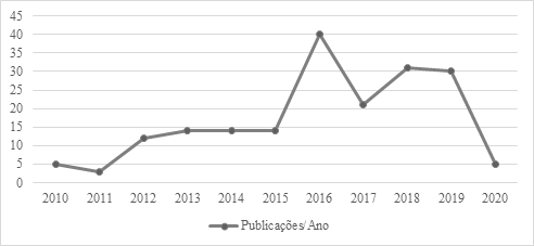 Na etapa de seleção dos trabalhos que seriam posteriormente analisados, optou-se pelo critério de avaliação dos títulos, dos resumos e das palavras-chave dos artigos que foram identificados, a fim de verificar quais contemplavam, ainda que parcialmente, a análise da PNEEPEI/2008. Entretanto, um expressivo quantitativo de artigos citava a referida política no título e/ou resumo, mas não efetivava a sua análise, sendo esses trabalhos descartados. Assim, nessa etapa de seleção, foram desconsiderados os trabalhos que anunciavam de alguma forma a PNEEPEI/2008, mas não a analisavam propriamente. O gráficoabaixo apresenta o quantitativo de trabalhos que foram eliminados, considerando seu ano de publicação, podendo ser identificado o predomínio de artigos que foram publicados e que de alguma forma mencionavam a PNEEPEI nos anos de 2016, 2018 e 2019.
