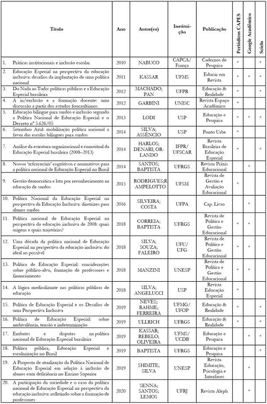 É importante destacar que os artigos selecionados representam uma amostra dos trabalhos que foram desenvolvidos com o objetivo de analisar a referida política, pois, pela necessidade de serem estabelecidos os descritores de busca, possivelmente os resultados foram limitados. Portanto, a partir da utilização desse recorte, não seria possível conhecer a totalidade de produções acerca desse tema. Assim, ao fim do processo de seleção, foram escolhidos 20 artigos científicos para serem integralmente analisados como forma de extrair o máximo de informações possíveis sobre as produções realizadas entre 2010 e 2020 que tiveram como objeto de investigação a PNEEPEI/2008.