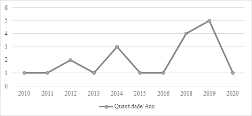 A partir da análise dos dados apresentados no quadro anterior, é possível afirmar que a maioria dos trabalhos foi publicada nos anos de 2018 e 2019, totalizando nove artigos, ou seja, 45% dos títulos que foram selecionados, como demonstrado no seguinte gráfico: