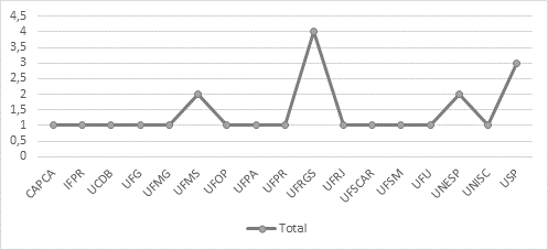 Esse dado demonstra que a maioria dos trabalhos encontrados foi publicada após o período de dez anos de divulgação da PNEEPEI. É preciso destacar que, no ano de 2018, alguns periódicos elaboraram dossiês em comemoração ao decênio da política, e esse fato pode ter contribuído para o aumento do quantitativo de produções que privilegiaram esse assunto nesse período. Como forma de quantificar o predomínio de trabalhos produzidos, considerando as instituições às quais os autores são vinculados, foi desenvolvido o gráfico abaixo: