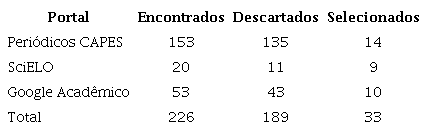Como terceiro passo, a utilização dos mesmos descritores no Google Acadêmico resultou em um quantitativo de 16.100 trabalhos na primeira tentativa de busca. Com o objetivo de promover um recorte na pesquisa, na segunda tentativa foi utilizado o termo “política nacional de educação especial”, apresentando 11.900 trabalhos. Em função de este número ainda ser expressivamente amplo e pela impossibilidade de análise de todos esses achados, optou-se pela busca de trabalhos que possuíam os termos exatos “política nacional” e “educação especial”, obrigatoriamente no título. Essa seleção gerou o quantitativo de 53 resultados, sendo 10 selecionados e 43 descartados. Assim, no total, foram encontrados 226 trabalhos, sendo 33 selecionados e 189 descartados, como será apresentado na tabela a seguir: