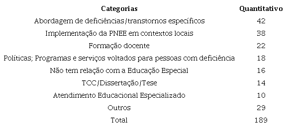 Inicialmente, os textos selecionados foram lidos integralmente a fim de que fossem estabelecidas categorias de análise com base nas discussões apresentadas. Cabe destacar que, apesar de todos os textos terem sido lidos de forma integral, como estratégia metodológica assumida na condução do balanço de produção, optou-se por utilizar somente os trechos dos trabalhos que se referiam especificamente à PNEEPEI, sendo desconsiderados os debates que citavam a Educação Especial, mas não possuíam relação com a política mencionada. Os textos analisados foram agrupados em cinco categorias desenvolvidas a seguir.