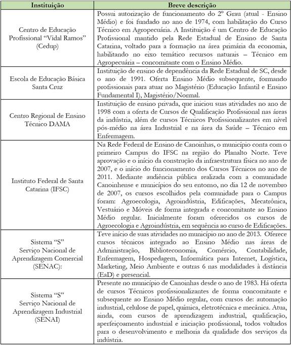 A Educação Profissional do município de Canoinhas-SC, está alinhada à Cultura e a história do município voltada para o desenvolvimento agropecuário, sistema econômico predominante na região, práticas sociais, formação humana e desenvolvimento comunitário. Conforme descrição a seguir, a Educação profissional está dividida nas seguintes instituições, apresentadas no Quadro 1, na sequência.