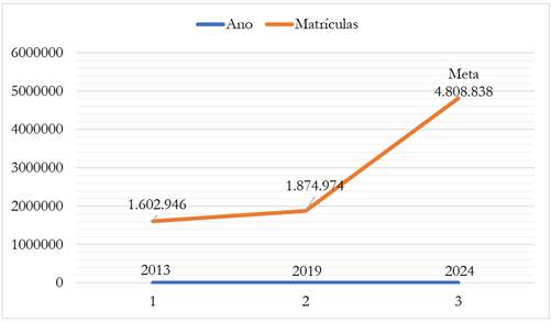 O Plano Nacional de Educação (PNE), Lei Nº 13.005 de 2014, possui metas e estratégias a serem cumpridas no percurso de 10 (dez) anos (2014-2024). A Meta 11 da Educação Profissional e Tecnológica (EPT) de nível médio, propõe que sejam triplicadas as matrículas deste nível de ensino, assegurando a qualidade da oferta e pelo menos 50% (cinquenta por cento) da expansão no segmento público. Contudo, pode-se observar pelo painel de monitoramento do PNE, dados do Censo da Educação Básica/Inep (2013-2019) que no ano de 2013 foram registradas 1.602.946 Matrículas em EPT de nível médio no Brasil e em 2019 - 1.874.974 matrículas. A meta é atingir 4.808.838 matrículas até o ano de 2024, porém, de acordo com os resultados de matriculas efetivadas no período de 2013 a 2019, nos primeiros 06 anos de monitoramento do PNE, obteve-se apenas 17% de acréscimo nas matrículas desta modalidade de ensino (BRASIL, 2014).