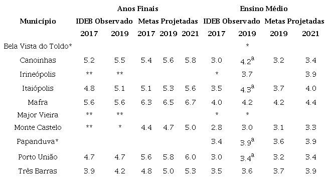 Conforme descrito na Tabela 1, a seguir, em todos os municípios em que constam os dados referentes aos anos finais, as metas projetadas não foram atingidas. Já no que se refere ao Ensino Médio, os dados se mostram promissores, visto que, dos oito municípios em que constam os dados de forma total ou parcial, quatro tiveram índices iguais ou superiores às metas projetadas para o ano de 2019, atingindo ainda a meta projetada para 2021.