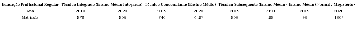 A Tabela 2, a seguir, apresenta o número de matrículas da Educação Profissional regular no município de Canoinhas-SC. Observa-se um aumento de 32,05% no acesso ao Ensino Técnico Concomitante (Ensino Médio), e de 39,8% no Ensino Técnico (Normal/Magistério), quando comparados os anos de 2019 e 2020. Já o Ensino Técnico Integrado (Ensino Médio Integrado) e o Ensino Técnico Subsequente (Ensino Médio) tiveram quedas de 14,05% e 2,55%, respectivamente.
