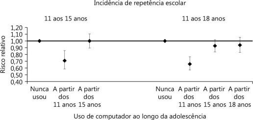 A Figura ilustra, resumidamente, o aparecimento dos novos casos de reprovação, em relação ao uso doméstico de computador, conforme a idade em que esse uso foi relatado e, igualmente, controlando para o efeito das variáveis de confusão já mencionadas. Os dados dessa figura estão expressos em termos de risco relativo (RR)18. Observou-se que os participantes que relataram utilizar o equipamento aos 11 anos apresentaram risco 29% menor (RR = 0,71) de reprovação escolar no intervalo entre os 11 e os 15 anos. O uso aos 15 anos, no entanto, foi igual ao dos que nunca usaram esse equipamento, nesse mesmo intervalo, indicando que o uso em tal idade não beneficia o desempenho escolar. Considerando o intervalo entre os 11 e os 18 anos, o uso aos 11 anos resultou em incidência 34% menor (RR = 0,66) de novos casos, enquanto o uso aos 15 e aos 18 anos resultou em incidências bem menores de reprovação (menos do que 10%), em relação àquela observada entre os não usuários, mostrando que o uso mais precoce/duradouro do computador esteve associado a menores taxas de reprovação escolar. Esse resultado está em consonância com o encontrado no relatório da OECD (2003): os jovens que utilizavam o computador há mais tempo (mais do que 5 anos), obtiveram escores acima da média no PISA, quando comparados aos que o utilizavam há menos tempo (um ano).