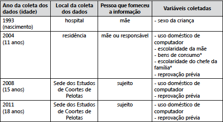 As variáveis incluídas nas análises realizadas neste trabalho foram coletadas por meio de perguntas estruturadas, que integravam os questionários do estudo “Coorte de Nascimentos de Pelotas, de 1993” (VICTORA et al., 2006; 2008), aplicados nos acompanhamentos de 2004 e 2008 e 2011, anos em que os sujeitos completaram 11, 15 e 18 anos de idade, respectivamente. A realização dos acompanhamentos não foi planejada para que fosse realizada, exatamente, nessas idades, embora tivesse o objetivo de coletar dados referentes ao início, ao meio e ao final da adolescência. As idades exatas foram determinadas, primordialmente, pela época em que os financiamentos para os acompanhamentos foram obtidos.
