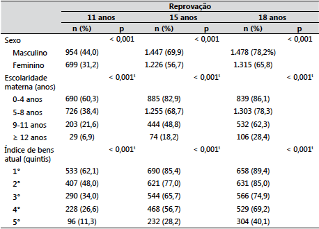 A Tabela 1 ilustra a ocorrência de reprovação escolar nas idades de 11, 15 e 18 anos, conforme características sociodemográficas dos adolescentes. A análise da reprovação por sexo mostrou que as taxas observadas em cada uma das idades foram sempre maiores entre os meninos. A probabilidade dessas diferenças entre os sexos terem sido encontradas por acaso foi menor do que 1/1000 (p < 0,001). Com relação à escolaridade materna e ao índice de bens, foi observada uma tendência linear inversa entre essas duas variáveis e a ocorrência de reprovação escolar: quanto maior a escolaridade materna e o quintil do índice de bens, menor o percentual de sujeitos com, pelo menos, uma reprovação em cada uma das idades avaliadas (p < 0,001). Os resultados expressos nessa tabela são semelhantes aos encontrados por outros pesquisadores que exploraram as associações entre fracasso escolar e tais variáveis (ALVES; ORTIGÃO; FRANCO, 2007; DAMIANI, 2006; MACHADO; GONZAGA, 2007; MENEZES-FILHO, 2007; ORTIGÃO; AGUIAR, 2013; VIEIRA et al., 2012).
