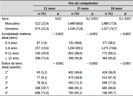 Quanto ao uso doméstico de computador, é notável a diferença encontrada entre os três acompanhamentos: aos 11 anos, 16,9% tinham computador em suas residências e 22,4% o usavam no tempo livre; aos 15 anos, esses percentuais eram iguais a 45,1% e 70,7%; e aos 18 anos, 76,6% e 75,8%, respectivamente. Tais dados demonstram o crescente investimento da população da cidade na compra de computadores, ao longo do período estudado, seguindo a tendência observada no país, ilustrada por meio dos dados do CETIC (2013), anteriormente apresentados. Como os percentuais de uso de computador (fora do contexto escolar) eram maiores do que os de posse desse equipamento, possivelmente, os sujeitos que afirmaram usar computador fora do contexto escolar, o faziam em centros públicos, de acesso pago ou gratuito, ou em casas de outras pessoas.