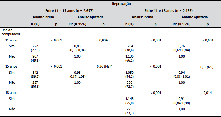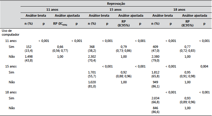 As análises ajustadas mostram um panorama um tanto distinto, pois foram verificadas associações significativas menores, para o uso aos 11 e aos 18 anos, entre as duas variáveis estudadas, e associações não significativas para o uso aos 15 anos: no grupo dos que utilizavam computador no domicílio, aos 11 anos, ocorreram 17% menos casos novos de reprovação do que no grupo que não utilizava esse equipamento dos 11 aos 15 anos (RP = 0,83; IC95%: 0,73 - 0,94) e 24% menos casos novos de reprovação no grupo dos que não o utilizavam dos 11 aos 18 anos (RP = 0,76; IC95%: 0,69 - 0,84), respectivamente. Não foi observada associação entre o uso doméstico de computador aos 15 anos e o aparecimento de novos casos de reprovação nos intervalos entre os 11 e os 15 anos e entre os 11 e os 18 anos. Quanto ao uso aos 18 anos, o percentual de aparecimento de novos casos foi menor em 8%, entre os usuários, no intervalo entre 11 e 18 anos.