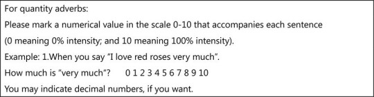 In this study, the authors started by choosing a set of quantity and frequency adverbs currently used by people when they want to mean the quantitative dimension of a cognition or an emotion. This is the starting hypothesis: A scale based on a stable measurement of the numerical value of these adverbs will present consistent and known distances between the various positions; thus it will be effectively an interval scale.