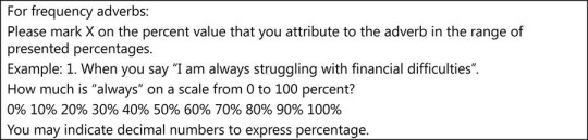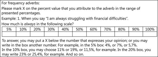This procedure is similar to Thurstone’s, who also asked respondents to evaluate the numerical value of a sentence (the difference being that in this case, it is a quantity or frequency adverb or adverbial expression). Its advantage is the possibility of being used with any sample of people who will answer a test or questionnaire, as the scale is independent of the content of the evaluated sentence. The same procedure was used with frequency adverbs; in this case, however, the numerical scale used frequency reasoning, evaluating the frequency adverbs within a continuum from 0% frequency to 100% frequency.