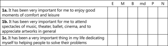 The questionnaire includes 21 sets, like the presented above, covering the most important areas of daily life: Personal life and family (11 sets); Work (5 sets); Leisure and free time (2 sets); Friends and friendships (3 sets).