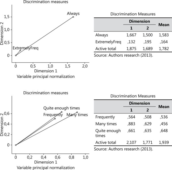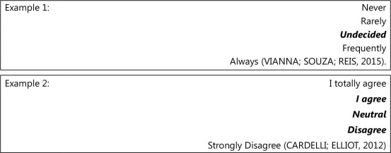 So this procedure allows us affirmatively answering the first question: the use of adverbs is an interesting basis for the construction of scales combining qualitative and quantitative approaches in a valid and reliable way. It allows avoiding the inaccuracies sometimes seen in Likert scales (LIKERT; ROSLOW; MURPHY, 1993) used by the authors, as shown in the two examples shown below:
