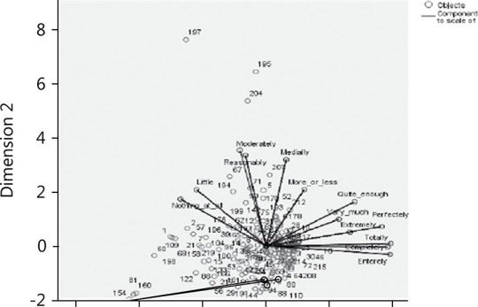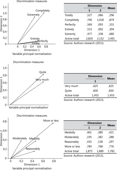 The study is complemented by the graphs presented in Figures 1, 2 and 3, resulting from the use of the Principal Component Analysis methodology for ordinal data as described in Borg and Groenen (2005), (procedure CATPCA in IBM SPSS-Statistics); it confirms the idea that it is possible to build an interval scale based on quantity adverbs, as could be expected.