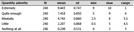 Two examples of these different scales (with 5 or 6 degrees based on the two categories of adverbs) can be found below (Tables 7 and 8).
