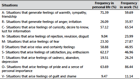 Second part: the test measures the affective tone of the subject’s life, by registering - in the frequency adverbs scale – the frequency of emotions felt in his personal life and at work (results shown in Table 10).